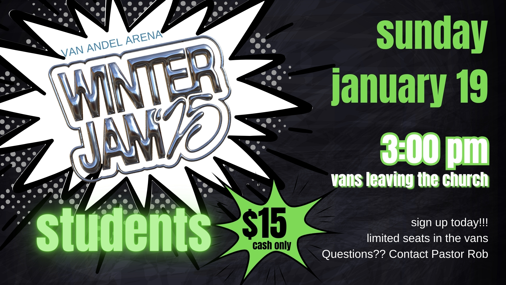 We will leaving Calvary main campus at 3pm to travel down to the Van Andel Arena for Winter Jam. Bring $15 to pay at the door. We will return to Calvary following the concert. Limited space will be available, so please sign up with Pastor Rob.