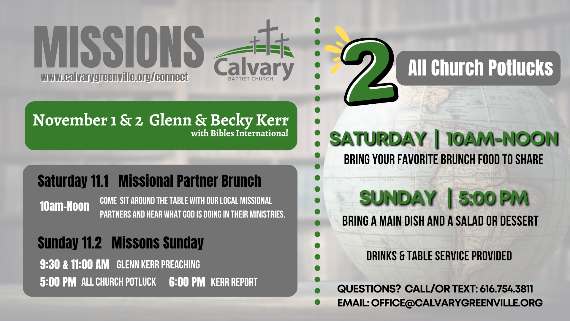 Missions weekend is a great time to meet and encourage some of our missional partners. Saturday, November 1st at 10 am, we will share a potluck brunch with some of our local missional partners. All are welcome - bring a breakfast dish to share. On Sunday, Glen Kerr will be preaching in the morning services. Sunday night at 5 pm, come bring a main dish and a salad or dessert to share. At 6 pm, Glen and Becky will share about the ministry of Bible translation that they have been partnering with for many years.