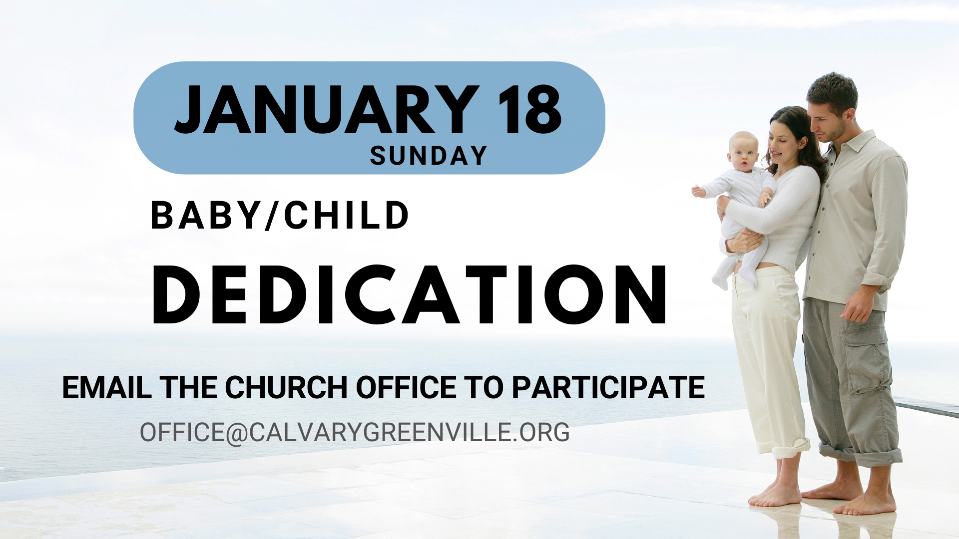 Baby/Child Dedication is on January 18, 2026. If you would like to dedicate your baby or child on January 18, please contact the church office at office@calvarygreenville.org or (616)754-3811. We will need your child's full name, date of birth and the names of the parents in your email.