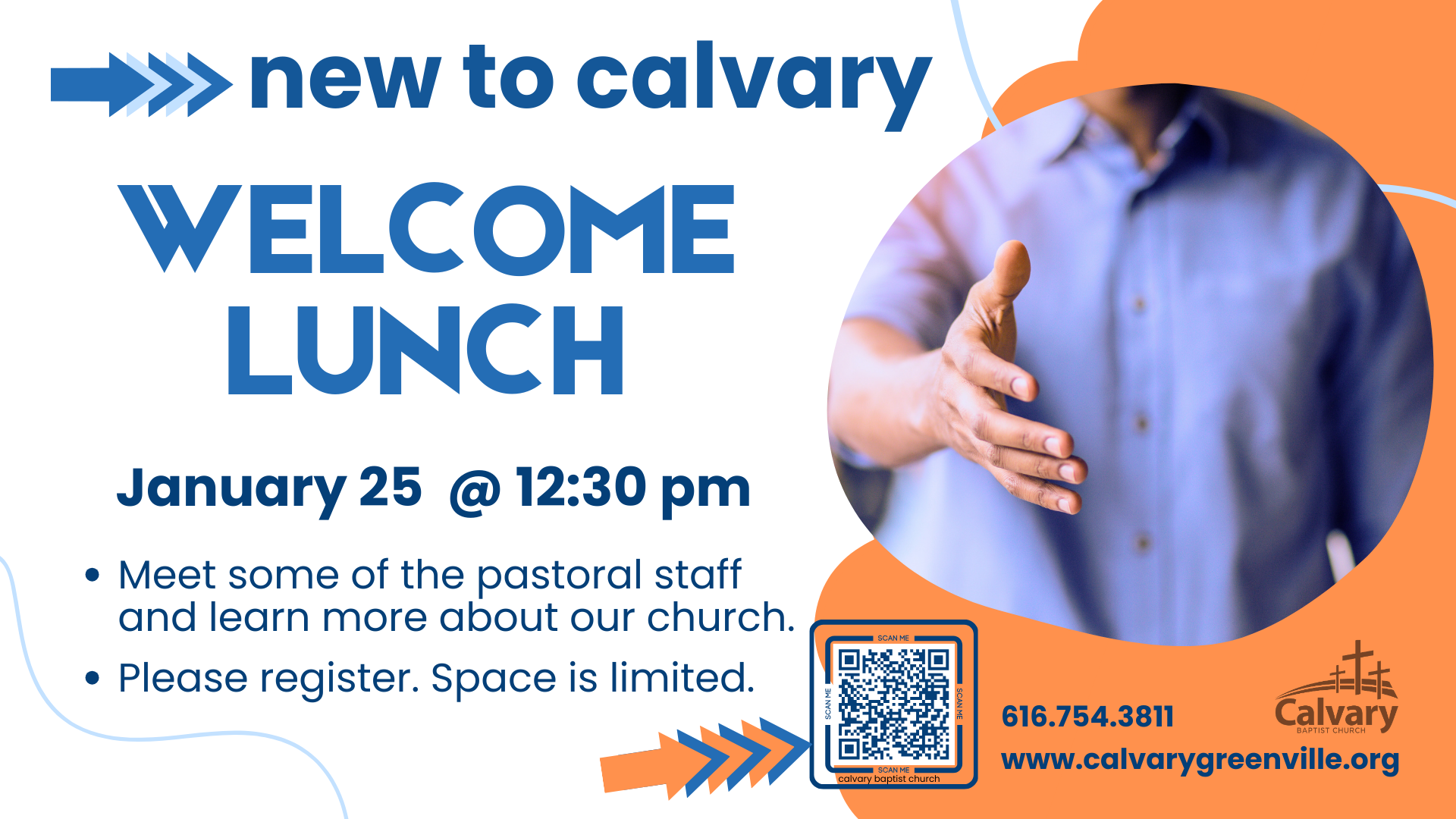 If you are "new" to Calvary and you'd like to meet some of the pastoral staff and learn more about our church, we'd like to provide lunch and answer your questions at a "welcome lunch" on January 25th. We'll talk about what you can expect from us as a church and what we do and do not expect from you. Please register so that we can plan accordingly. Space is limited.
