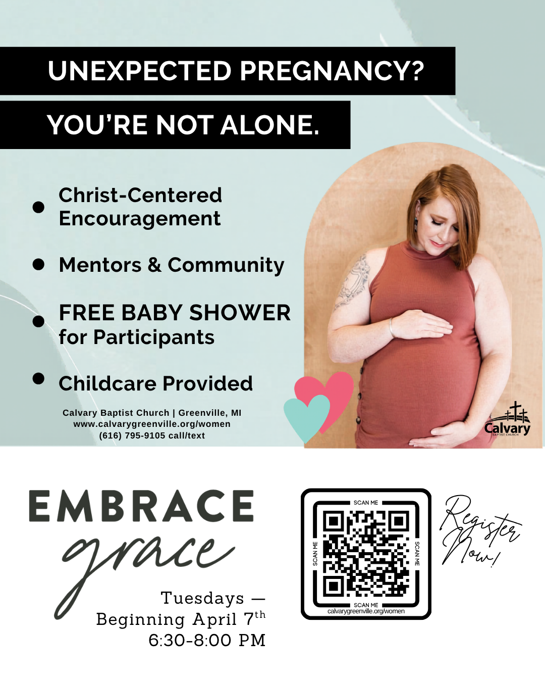 Embrace Grace is a 12-week support group offering emotional, practical, and spiritual care to unmarried pregnant women or women who have recently welcomed a baby (typically under 3 months old). Our program surrounds these courageous women with a network of support while teaching them about the boundless love and grace of God.
