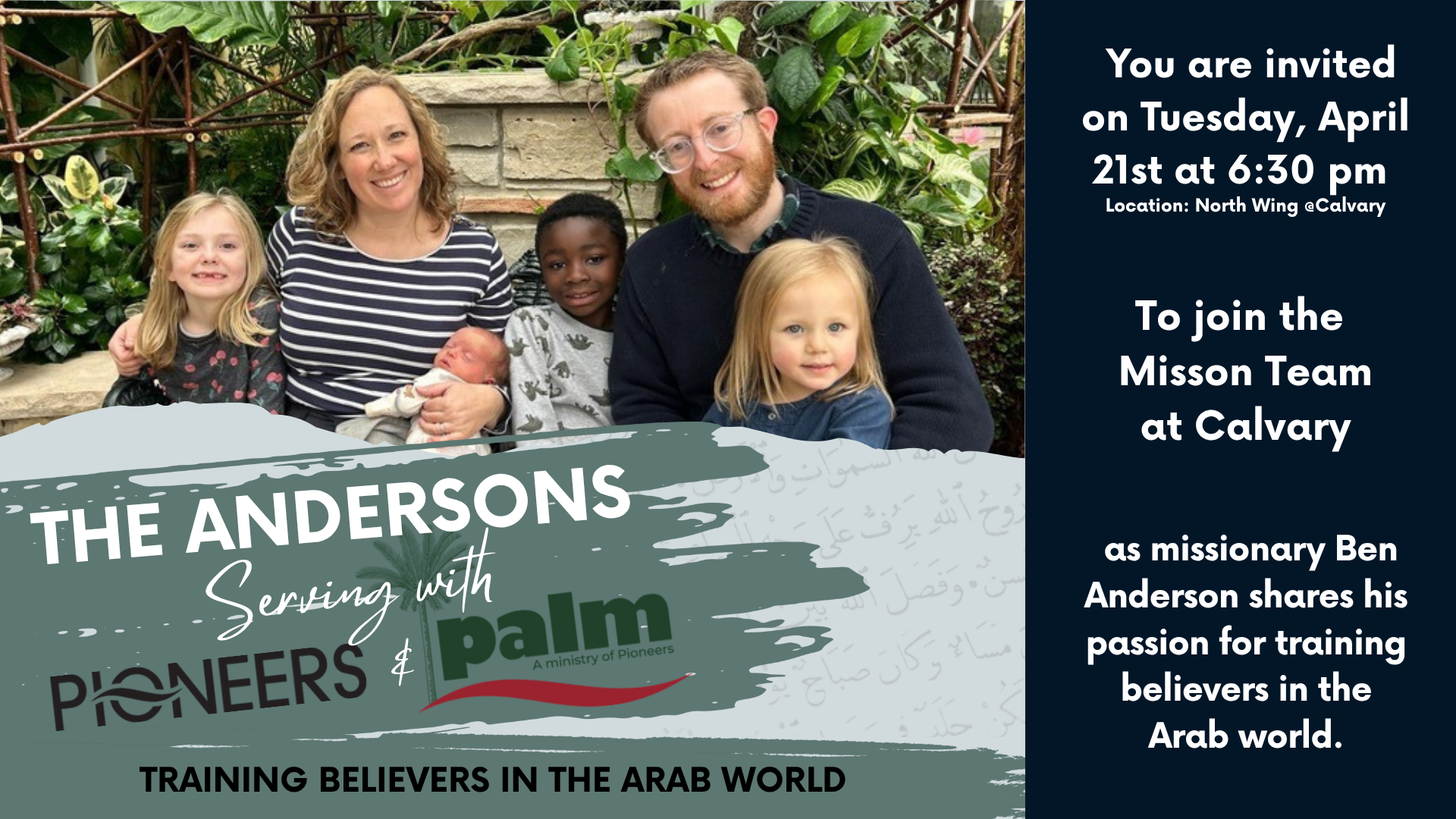 Come join the missions committee as we hear from Ben Anderson. Ben serves with Pioneer and Palm ministries, which involved training and outreach to the Arab communities around the world. The meeting begins at 6:30 pm.